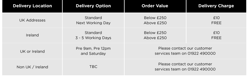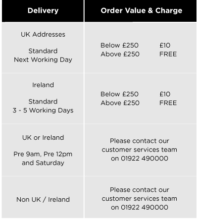 Please see delivery table for all delivery charges. We are unable to accept orders online that do not have a UK postal address or Ireland address for delivery.  If your delivery address is an Ireland address, it is your responsibility to select this in the delivery options. Selecting the incorrect delivery option may incur additional charges and a delay in your order. If you do not have a UK or Irish postal address, please contact the sales office for alternative options for order and delivery: 01922 490000.
