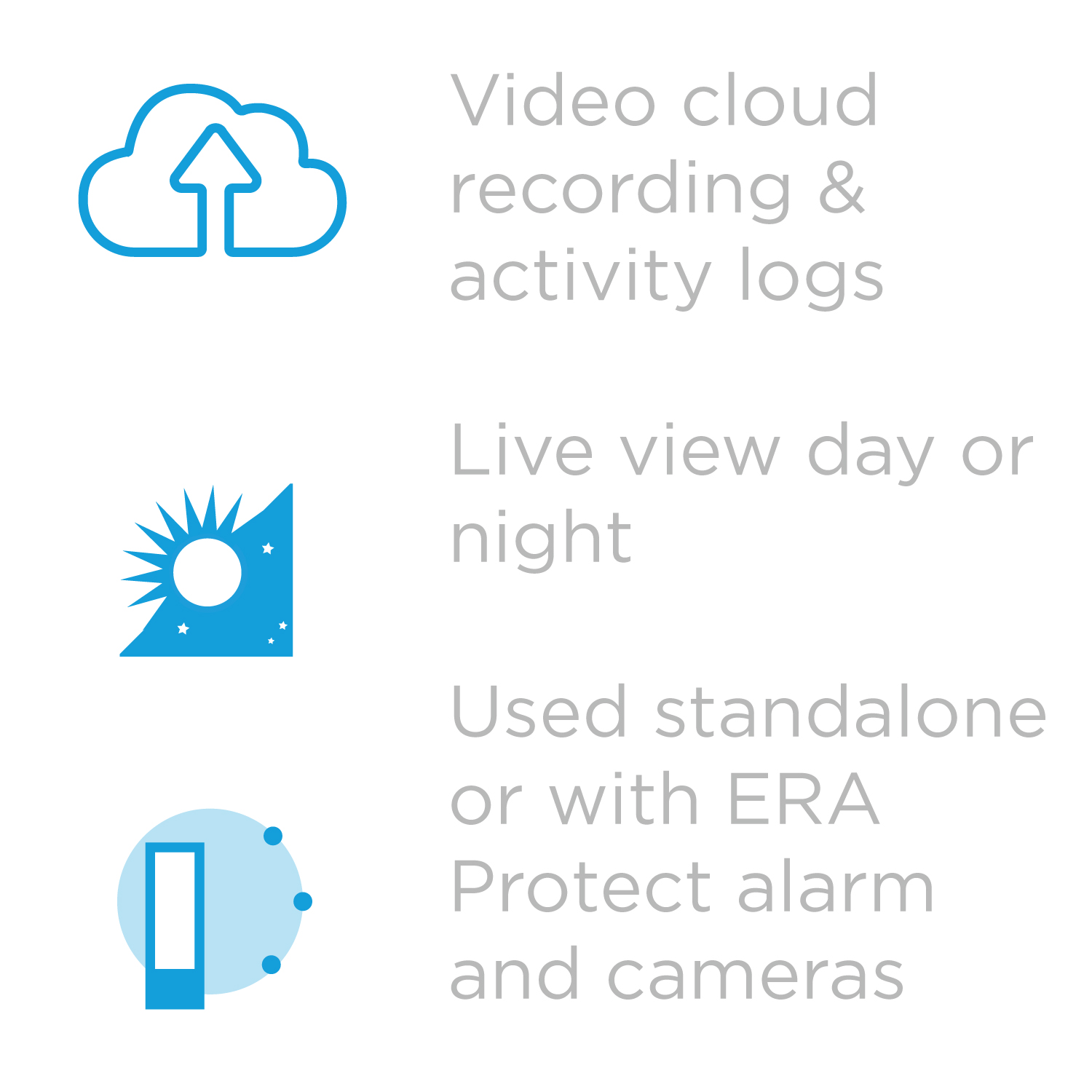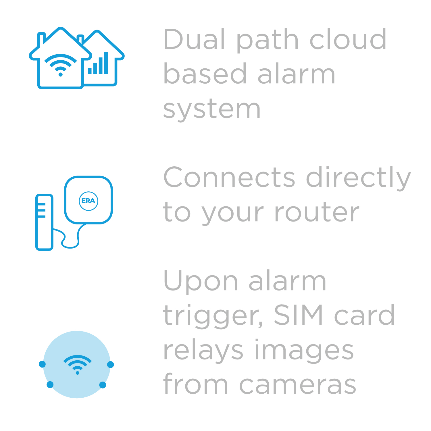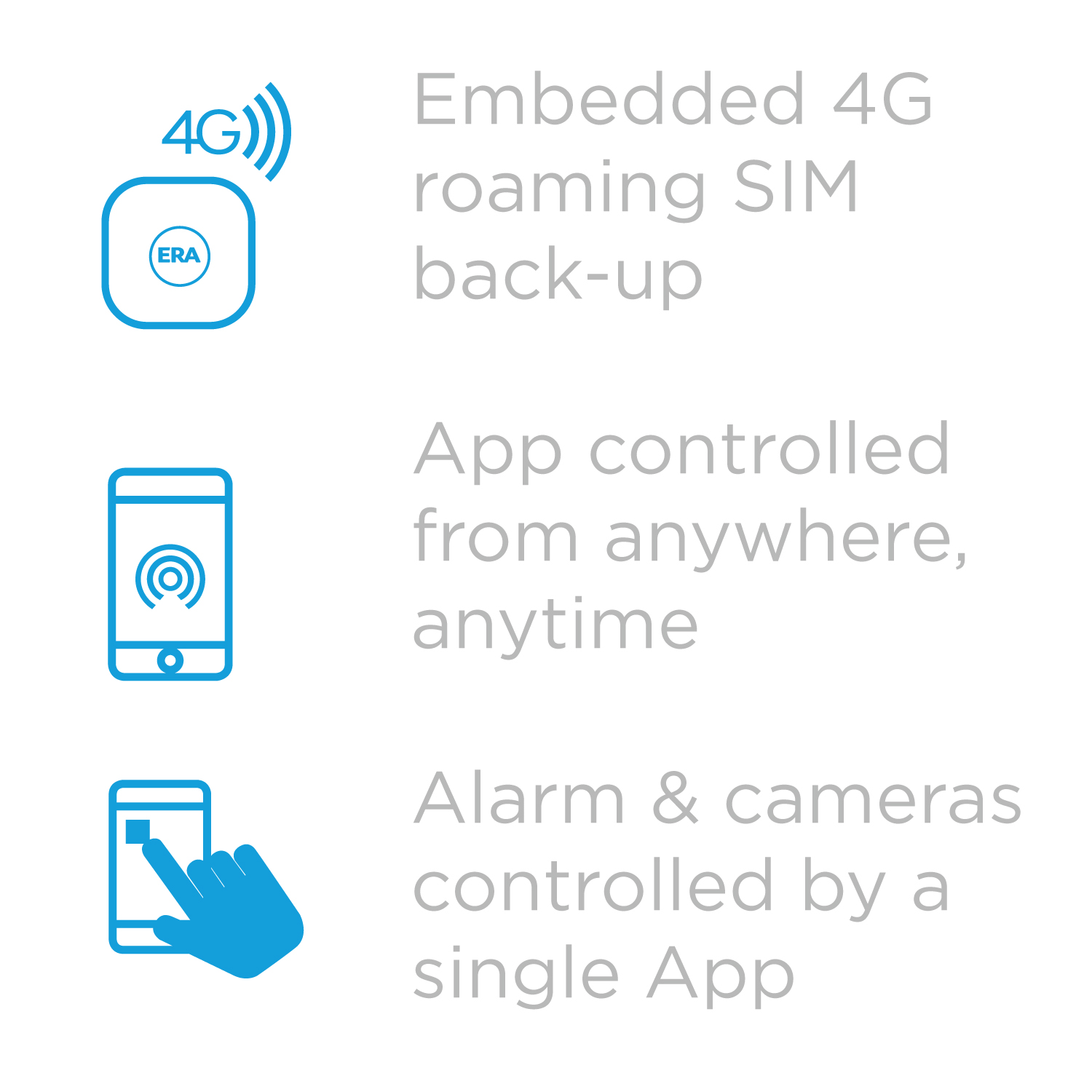 Offering 24/7 monitoring with a unique difference, in the event of a broadband outage, the hub switches to the built-in 4G Roaming back-up SIM that is not affiliated with any network provider, simply using the strongest 4G signal it can find. In addition, should the alarm trigger, the hub allows continued recording of HD video from ERA Protect Cameras to the cloud.