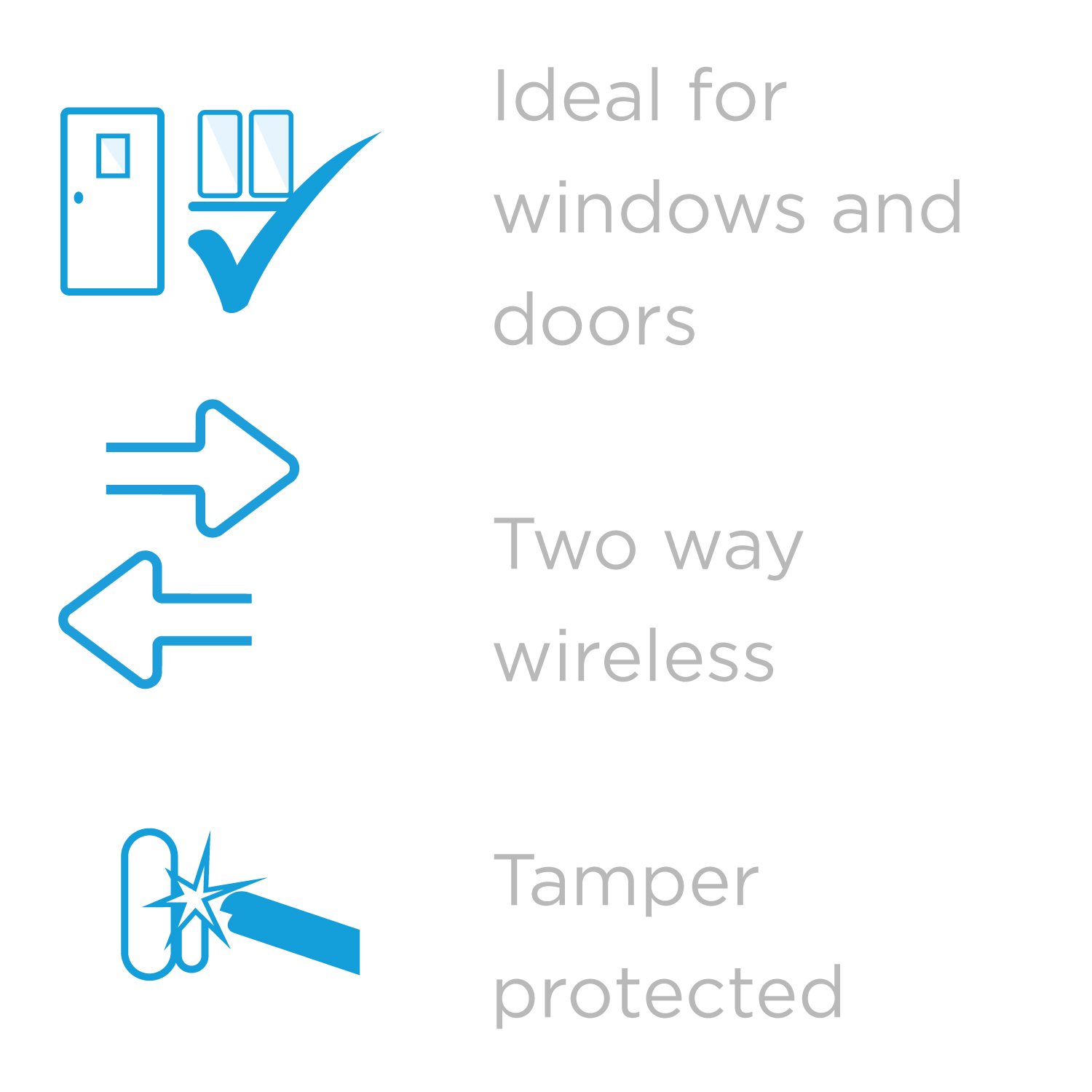 The wireless Window/Door Sensor connects to the system to provide alerts on arming (open warning) as well as alerts when triggered.