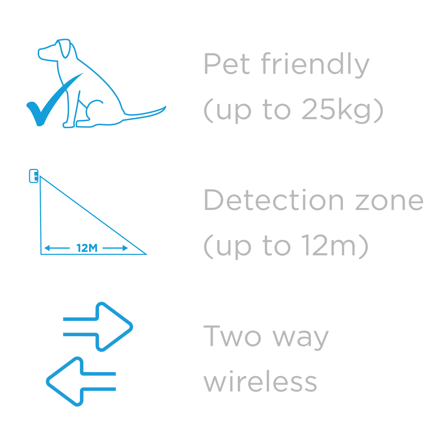 This PIR sensor detects movement and is pet friendly up to 25KG pets. The sensor can be wall mounted and angled and when armed, it will trigger the alarm when it senses movement.